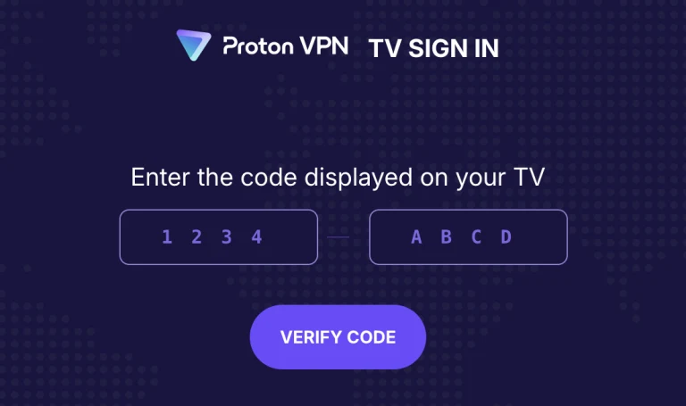 To sign in using this code, grab another device (smartphone or laptop) and go to https://protonvpn.com/tv. Enter your username and password to sign in. Enter the 8-digit code from your TV screen, then select Verify code.