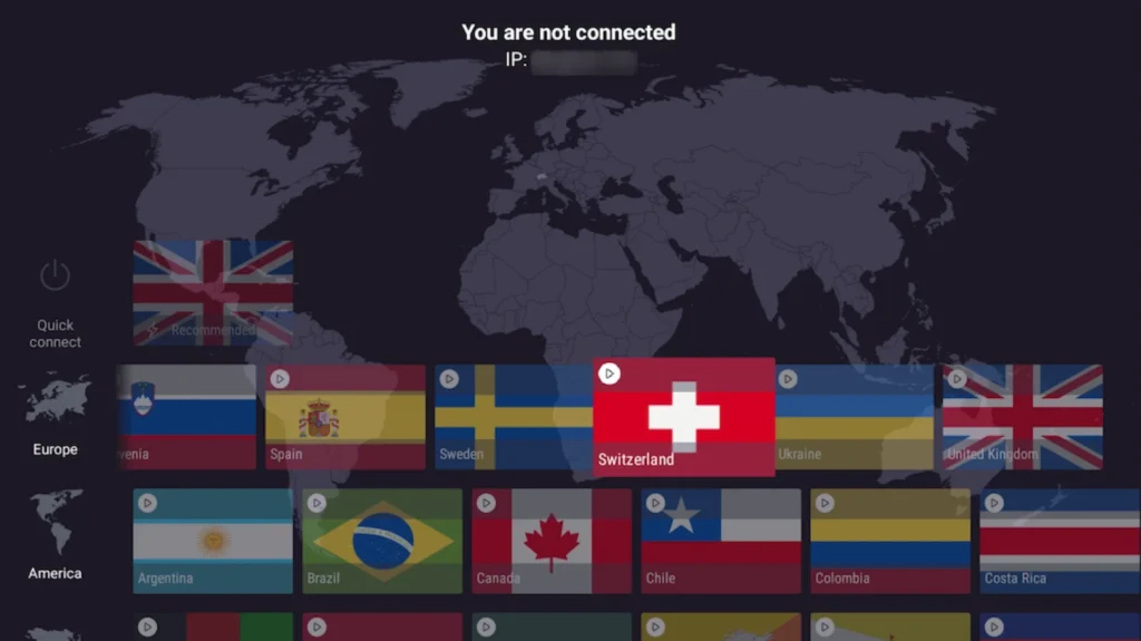 Use your remote to navigate between countries and connect to a server by selecting Connect.